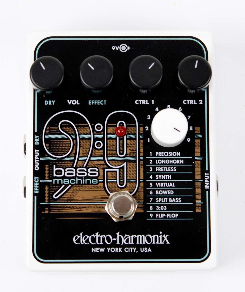 The polyphonic BASS9 Bass Machine transforms a guitar into nine different basses and requires no special pickups, MIDI or instrument modifications. It relies on the same technology powering all EHX 9 Series pedals, like the award winning MEL9® Tape Replay Machine, but features a new algorithm maximized for transposing one to two octaves down with superior dynamics and tracking.