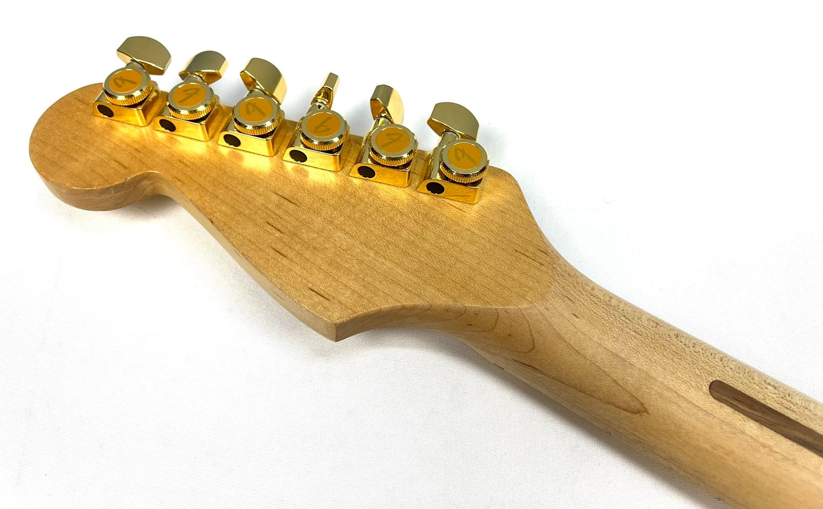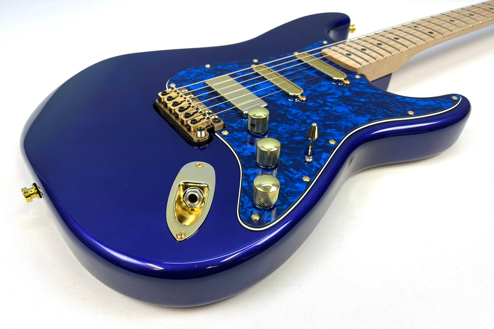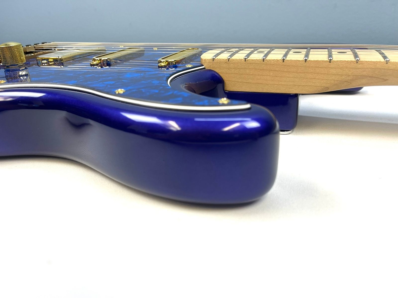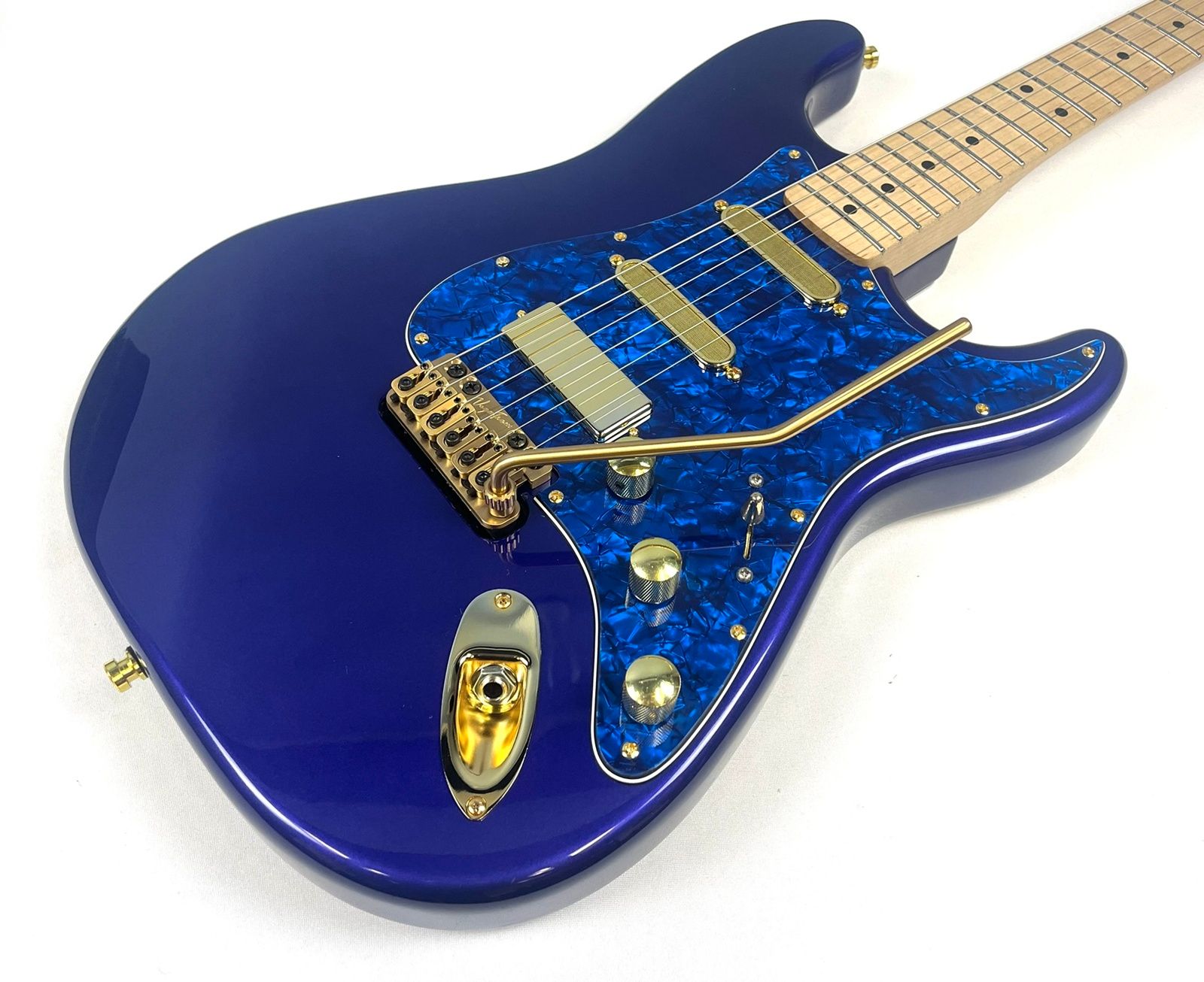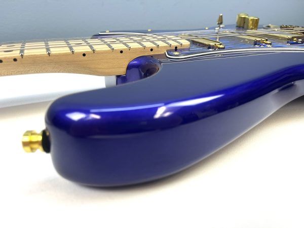 In addition to all the upgrades mentioned, our technicians decided to go all out on the pickups and electronics. For the neck and middle pickups, we installed Lollar Super Strat single coils. In the bridge, we dropped in a Lollar Firebird mini humbucker. Over $500 in pickups alone! And yes, they’re also gold. We love gold around here.