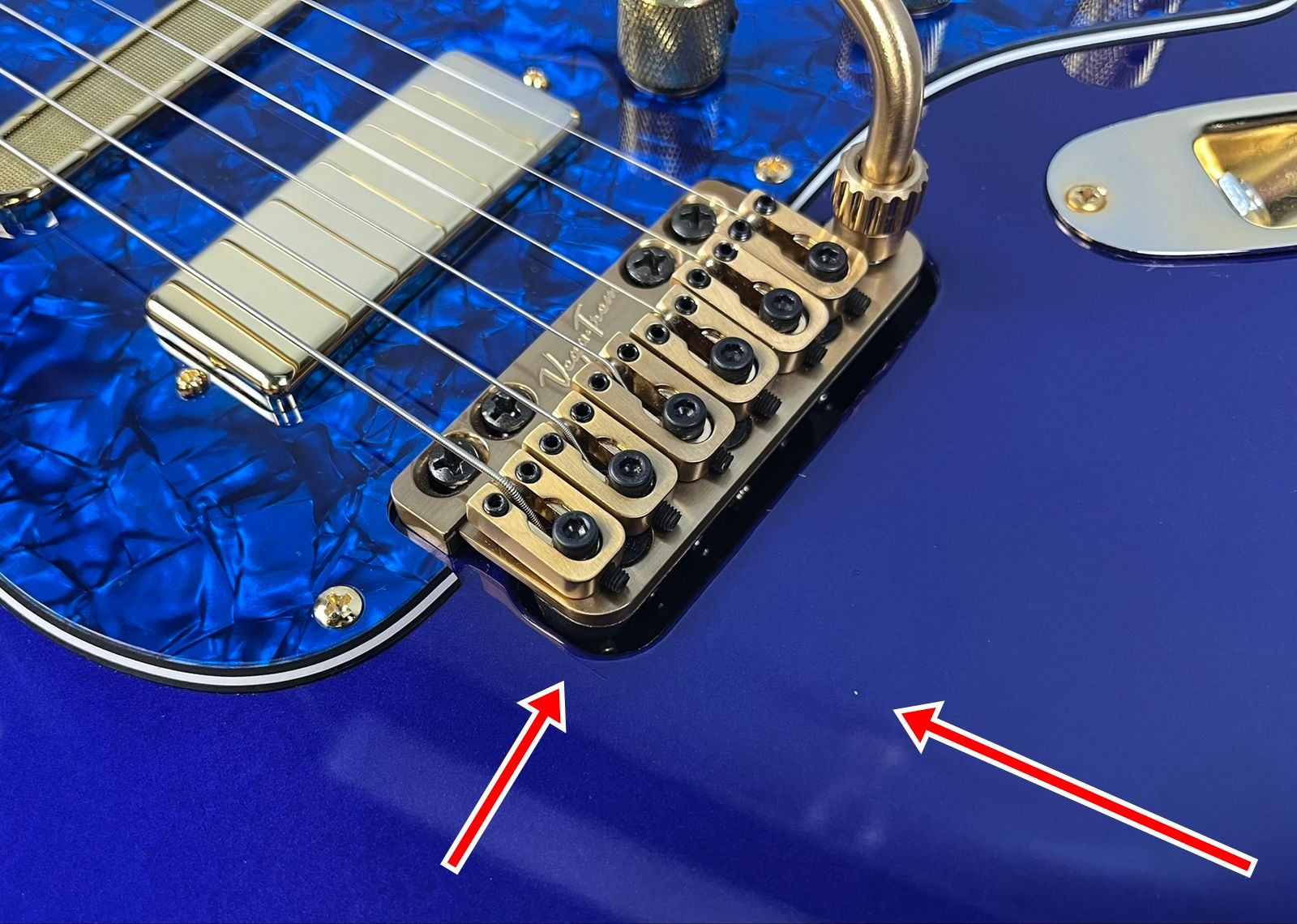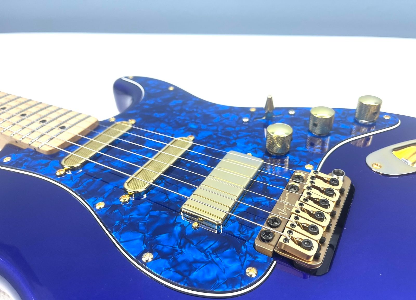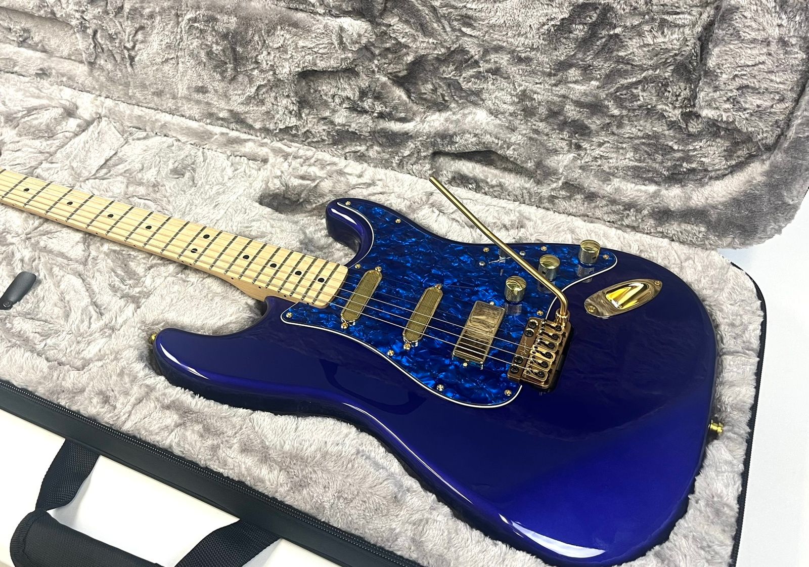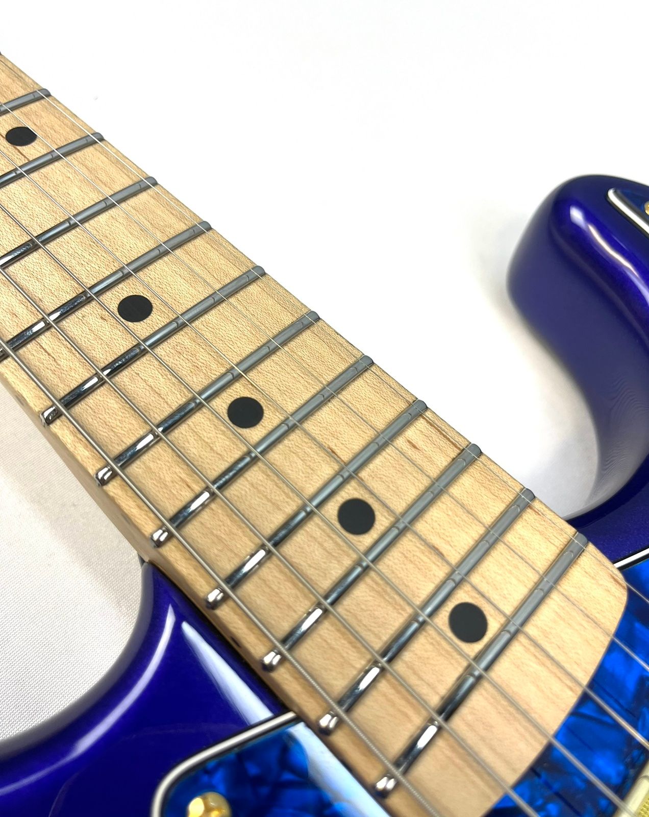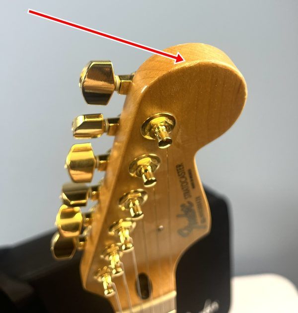In addition to all the upgrades mentioned, our technicians decided to go all out on the pickups and electronics. For the neck and middle pickups, we installed Lollar Super Strat single coils. In the bridge, we dropped in a Lollar Firebird mini humbucker. Over $500 in pickups alone! And yes, they’re also gold. We love gold around here.