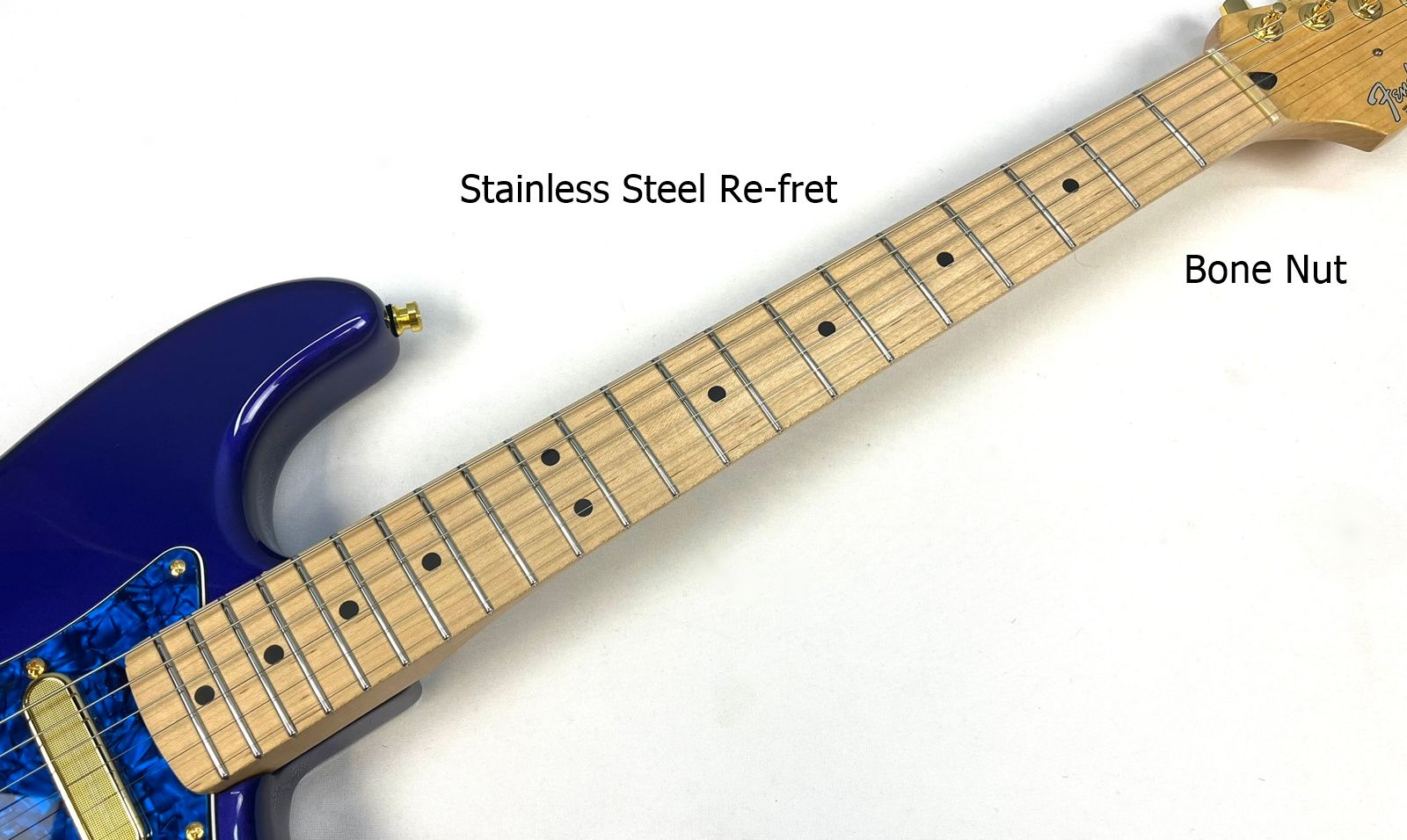 Not just a looker. But a fantastic player too. The finish on the maple fingerboard and the back of the neck have been removed; resulting in a smooth and fast playing neck. Additionally, the guitar has been re-fretted with stainless steel along with the installation of a bone nut. The gold Fender locking tuners in combination with the gold Vega Trem system provide excellent tuning stability, all while having a loose and expressive floating vibrato. The Vega Trem also comes with extra springs to easily adjust the level of tensions (see photos).