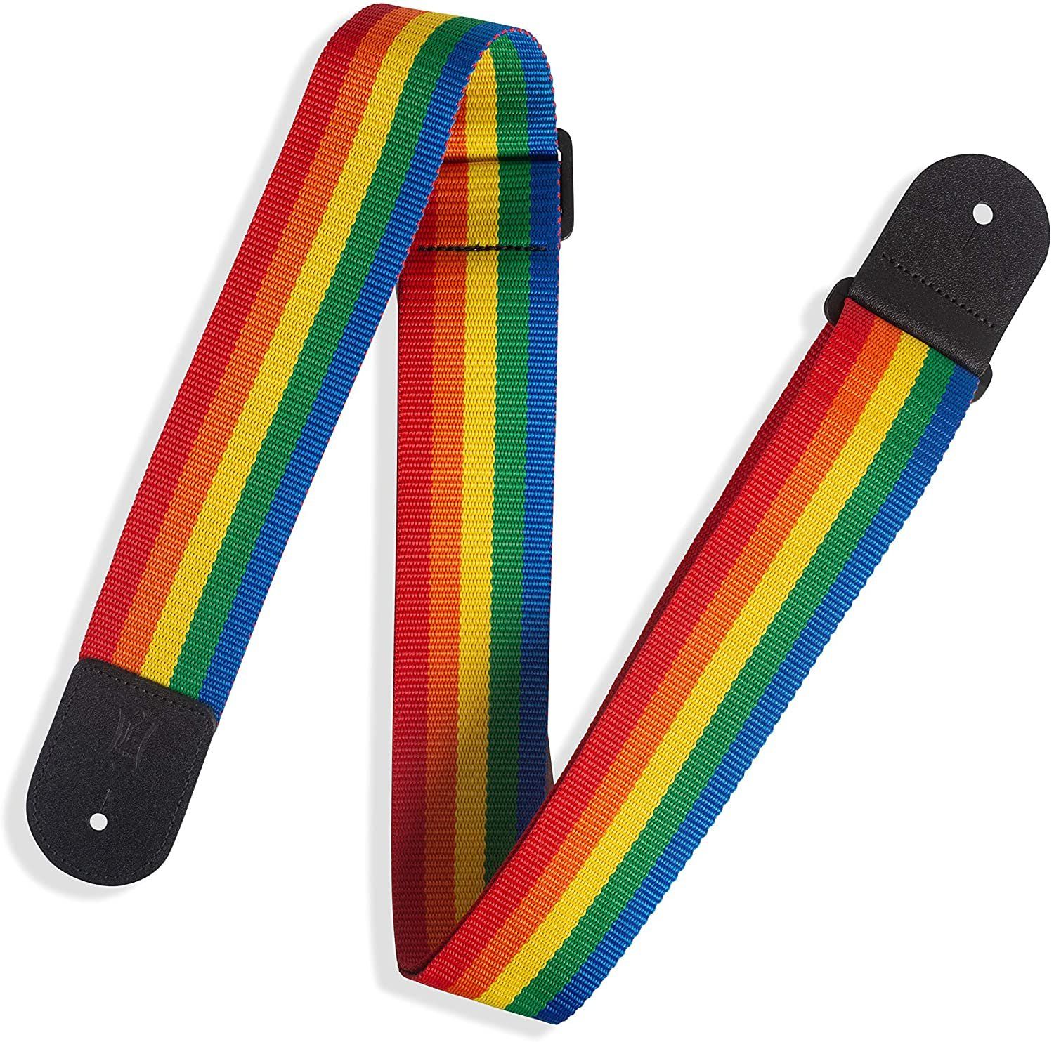 • Levy’s 2″ rainbow polyester guitar strap with one-ply black top grain leather ends.